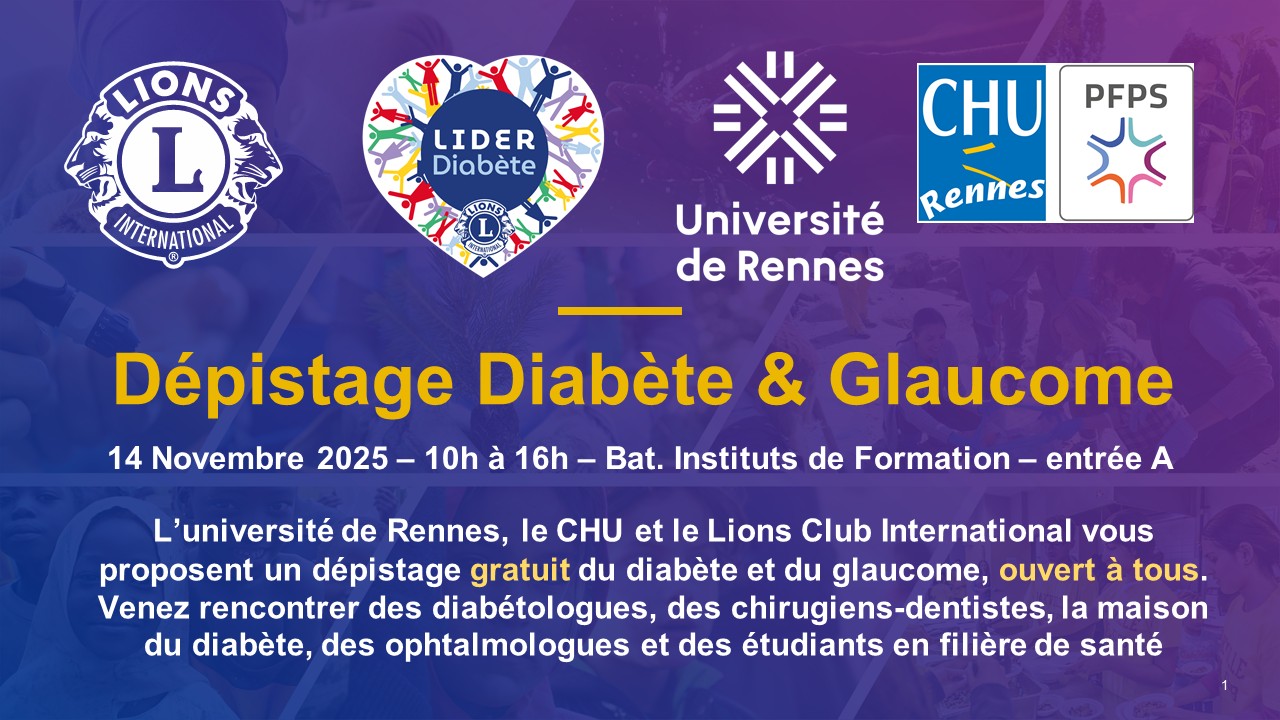 Le CHU de Rennes, l’université de Rennes, et le Lions Club International vous proposent un dépistage gratuit du diabète et du glaucome, ouvert à toutes et tous.