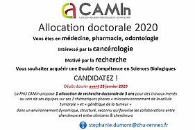 La FHU CAMIn propose 1 allocation de recherche doctorale de 3 ans pour des travaux menés au sein de ses équipes sur ses 2 thématiques phares « microenvironnement de la cellule tumorale » et « génétique de la tumeur » dans un environnement dynamique, structuré, reconnu qui favorise les collaborations entre chercheurs et entre cliniciens & chercheurs.